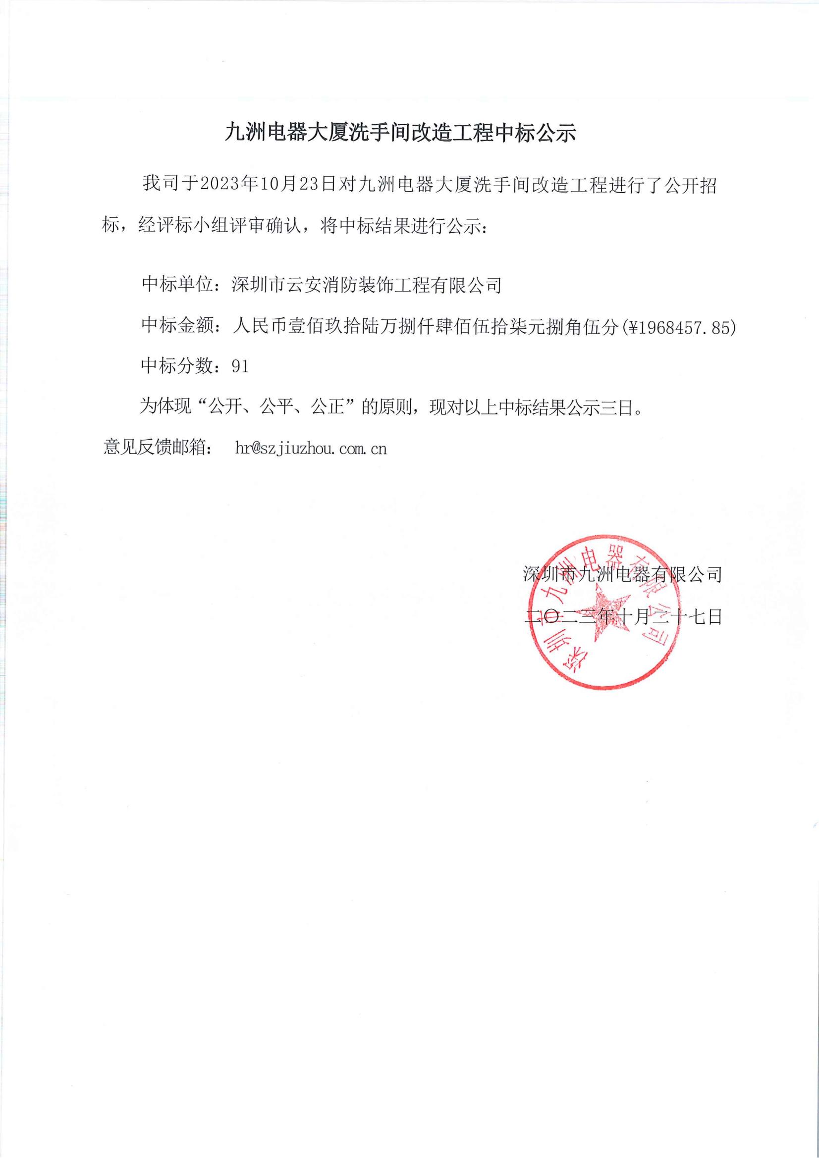 九洲電器大廈洗手間改造工程中標公示