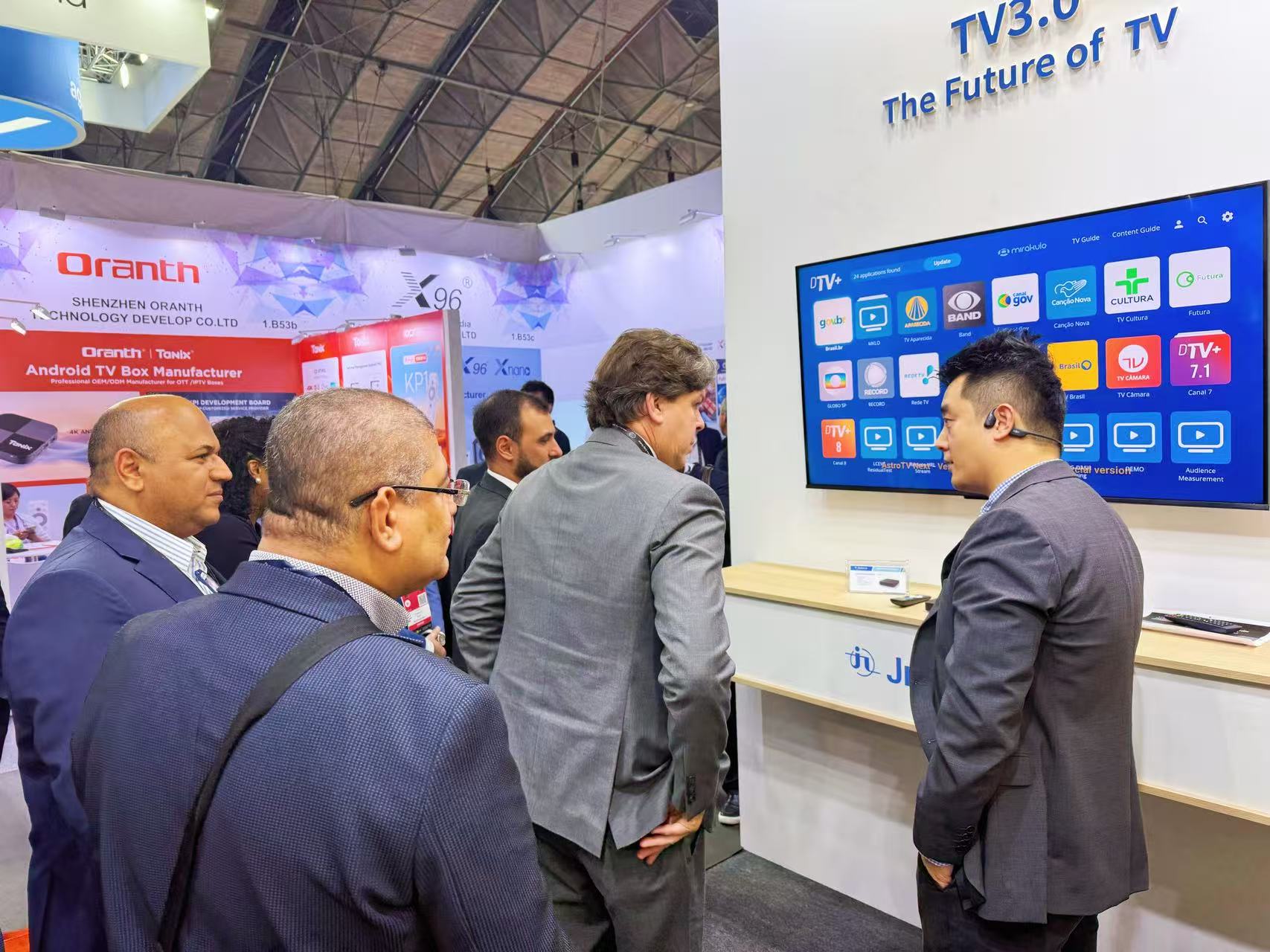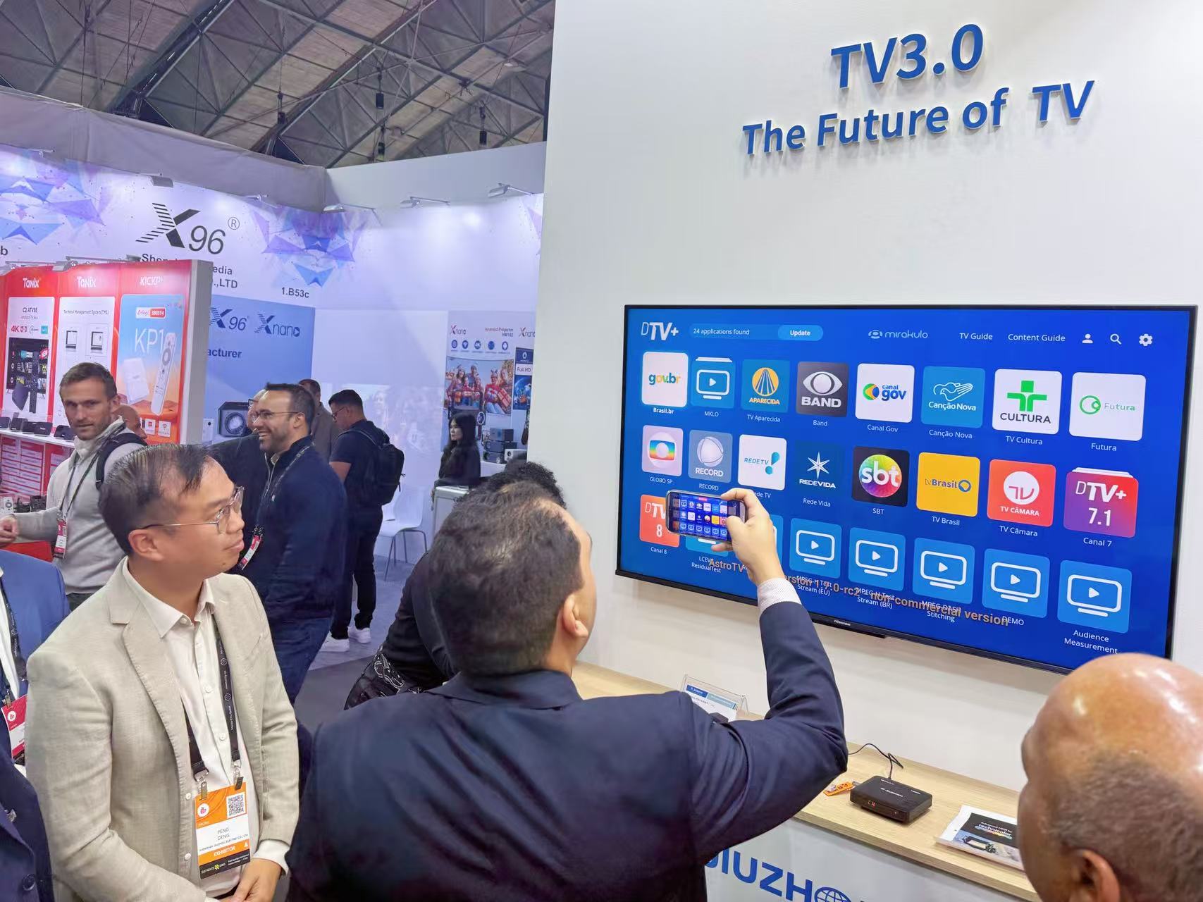 與此同時,最新研發(fā)的巴西下一代數(shù)字電視標(biāo)準(zhǔn)TV 3.0機(jī)頂盒引發(fā)高度關(guān)注 — 巴西通信部部長Frederico de Siqueira Filho駐足九洲展位,認(rèn)真聆聽海外銷售團(tuán)隊(duì)對該產(chǎn)品的講解。該產(chǎn)品憑借 “多標(biāo)準(zhǔn)兼容 + 超高清體驗(yàn) + 場景適配” 的核心優(yōu)勢脫穎而出:一方面解決了不同區(qū)域信號接收的適配難題;另一方面搭載 Andriod 4K 系統(tǒng),以超高清音畫技術(shù)精準(zhǔn)還原細(xì)膩光影細(xì)節(jié)與立體聲音效,再結(jié)合多元內(nèi)容池的資源支撐,可靈活滿足家庭集體觀影、個人碎片化追劇等多樣化需求,成為本次展會中體現(xiàn) “技術(shù)適配性 + 用戶體驗(yàn)感” 的代表性產(chǎn)品。