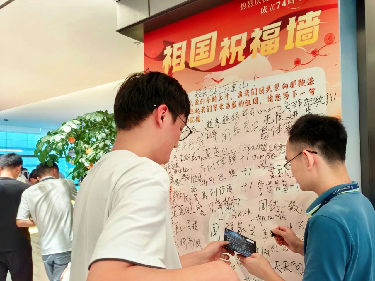 同事們?cè)谧鎳?guó)祝福墻提筆寫下對(duì)祖國(guó)的美好祝愿或?qū)ι畹拿篮迷妇?。一句句?dòng)人的祝福語,抒發(fā)了大家真摯的愛國(guó)之情。